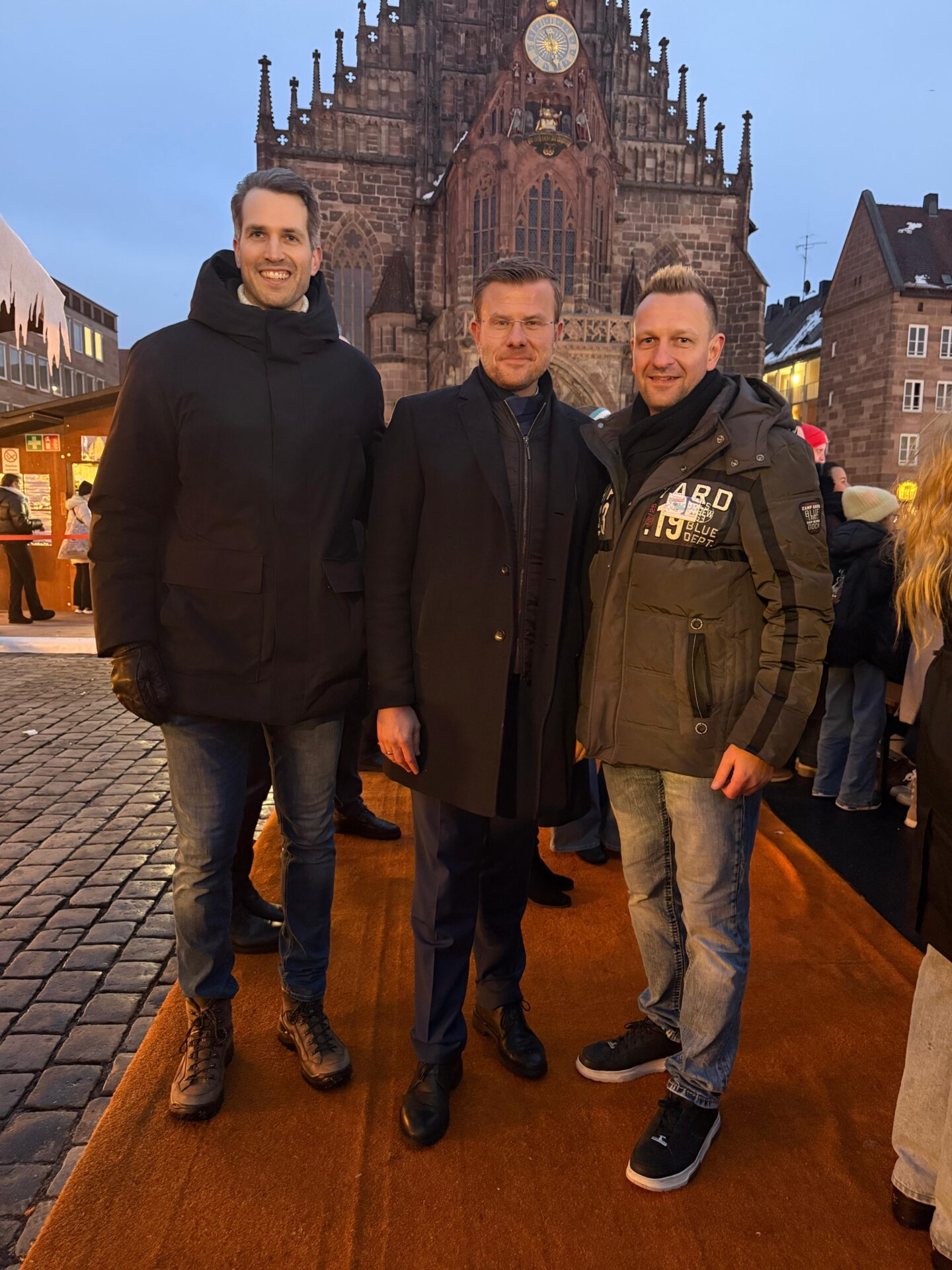 BU: Bei der Eröffnung der Winterwelt Nürnberg 2026: v.l.n.r.: Max Oppel vom Post SV, Oberbürgermeister Marcus König und Thomas Ludwig, Geschäftsführer PCS365. Bildrechte: PCS365